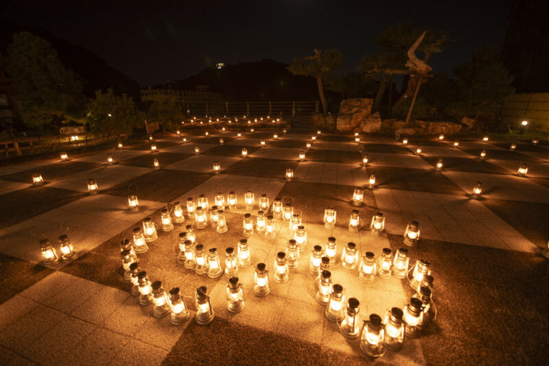 今夜は208台のランタン。舘山寺門前広場の奥の広場も含めて全面ランタンを並べて、プラス、来場のお子さんの名前を形作って写真プレゼントをしたり。
