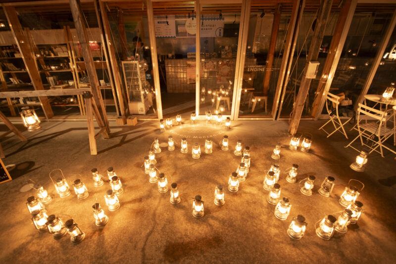2月14日はバレンタインということで、ハート×3のフォトスポットをつくりました。ご来場の方とみなさんとご一緒にランタンを点けて、この日だけの限定レイアウトに。