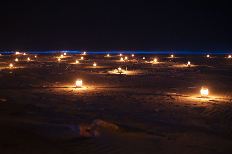 防潮堤で袋井市役所のスタッフのみなさんにランタンの点け方をご来場の方へレクチャーいただき点灯。砂浜に星空のようにランタンの灯りが散りばめ、「DORI」の文字が幻想的にランタンで灯されました。