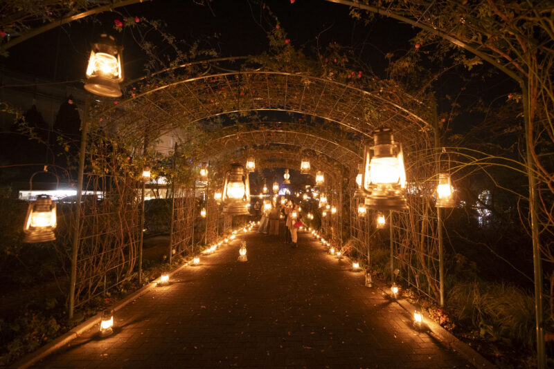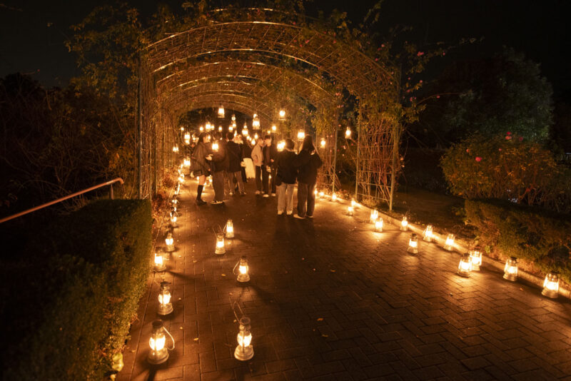 バラ園のアーチの先のバラ園は夜になると真っ暗のため、ランタンを1つお渡しして夜の花見体験も。
