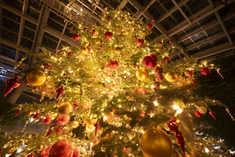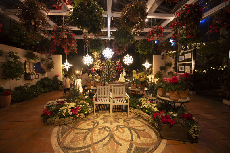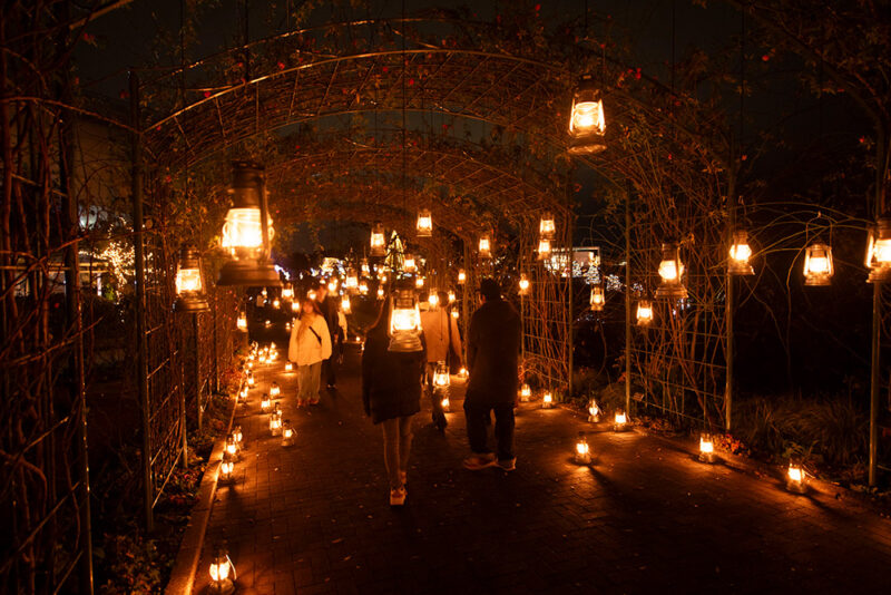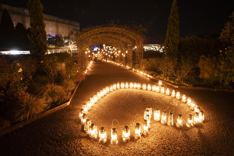16時頃から大温室クリスタルパレス横のバラ園のアーチに、スカイランタン用のロープを準備。16時50分ごろからご来場のみなさんとご一緒にランタンを点けて、スカイランタンにしたり、下に並べて光の道をつくったり。その先には大きなハートをランタンでつくってフォトスポットに。